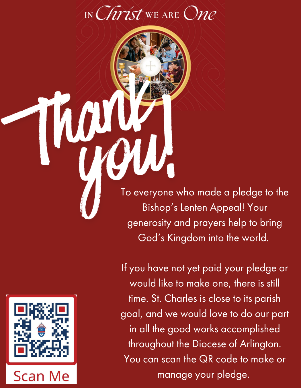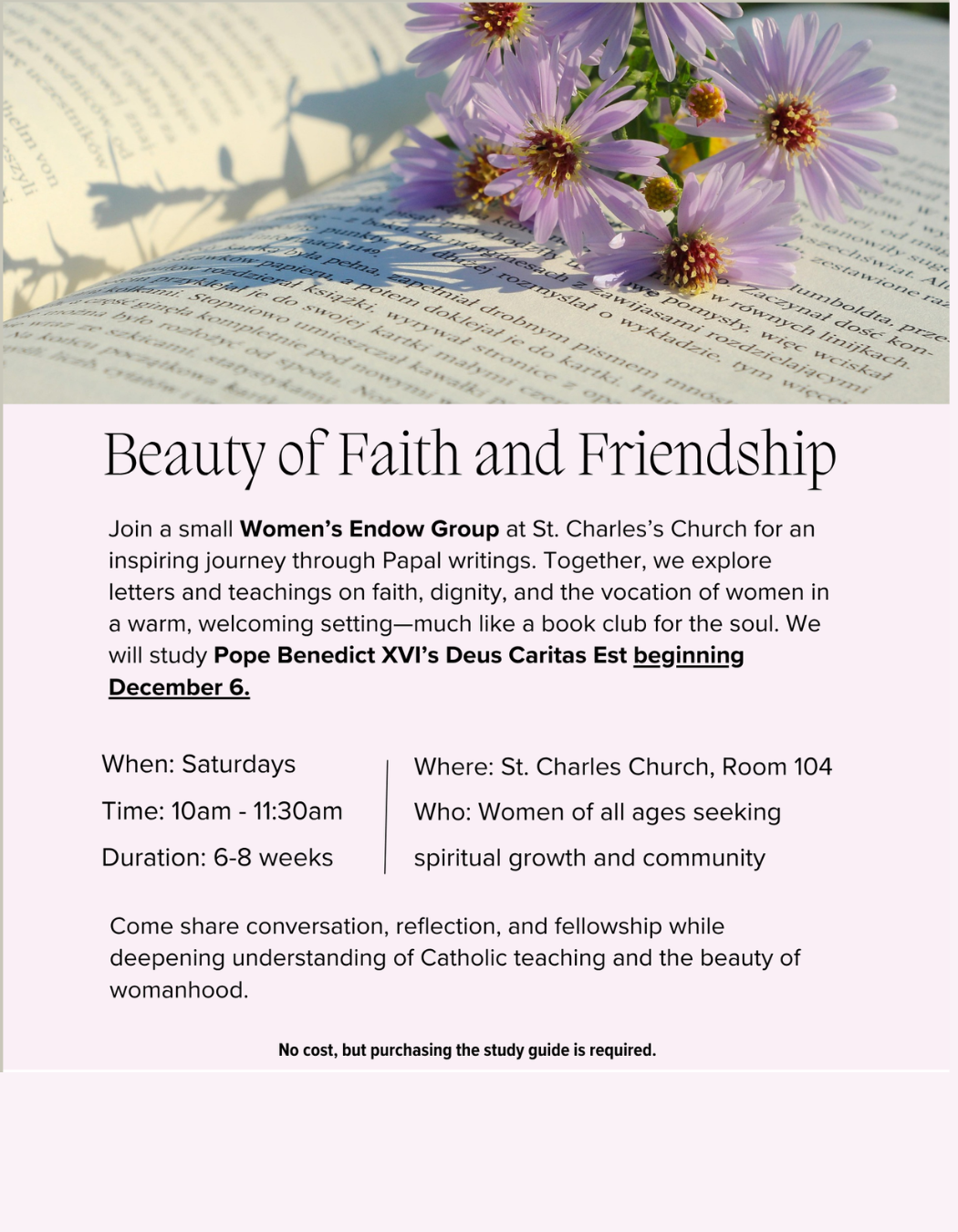 At St. Charles Parish we proclaim, celebrate and live the more abundant life of God through comprehensive formation in the faith, through a rich sacramental and prayer life, and through fellowship in love. We invite everyone to a personal encounter with Jesus Christ, and to fellowship with his faithful.