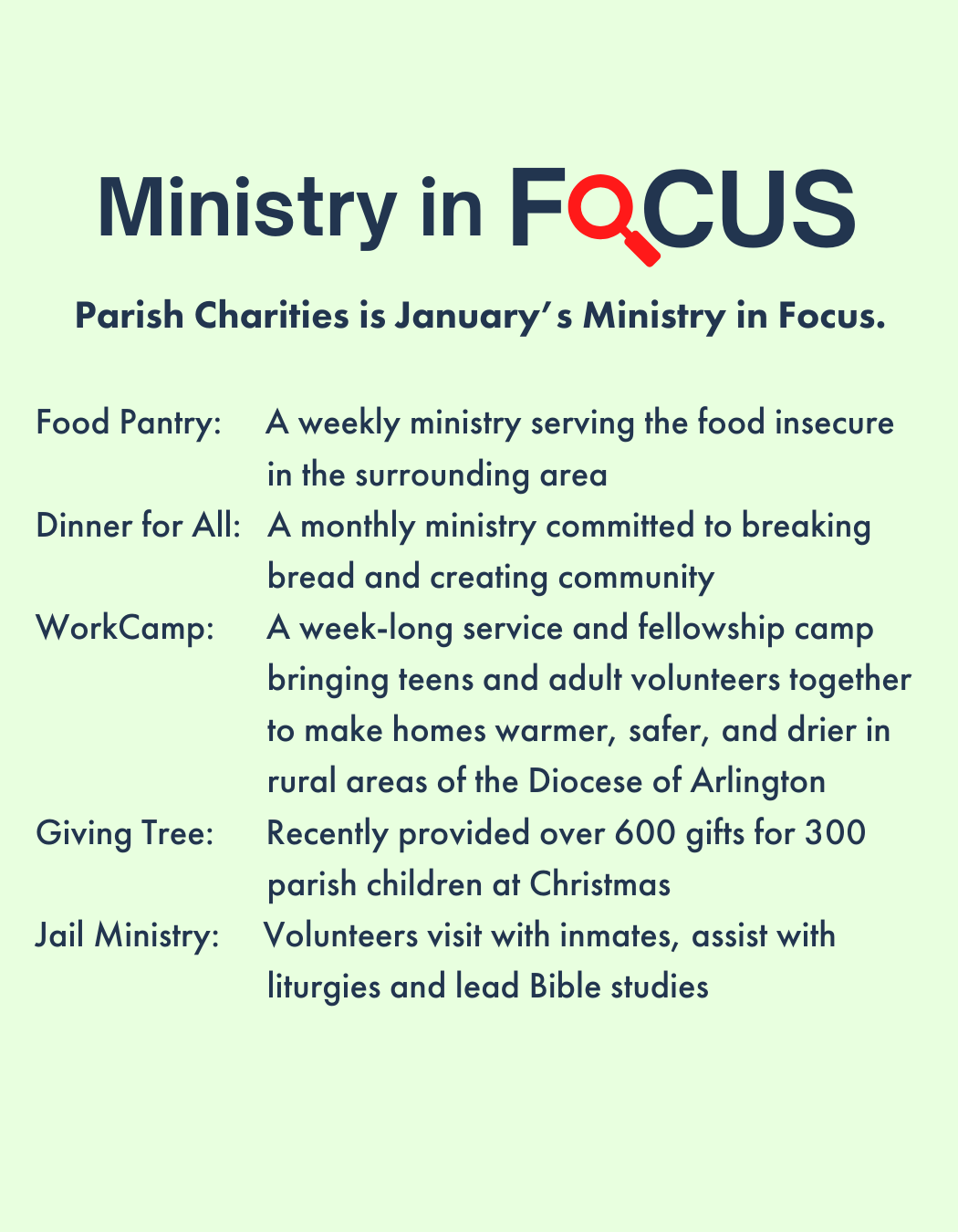 Bishop Burbidge, in union with all the bishops in our country, has asked every parish to implore God’s assistance in healing divisions in our nation by making a Holy Hour for Peace in the days to come, to pray for peace, justice, and reconciliation in our nation. Please read his statement here: https://www.arlingtondiocese.org/2026/01/30/bishop-michael-f-burbidge-invites-all-to-consider-a-holy-hour-for-peace/